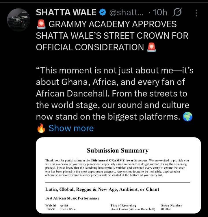 Ghanaian Dancehall Act, Shatta Wale is making waves as his song titled street crown has been officially approved for consideration in the prestigious Grammy Awards.