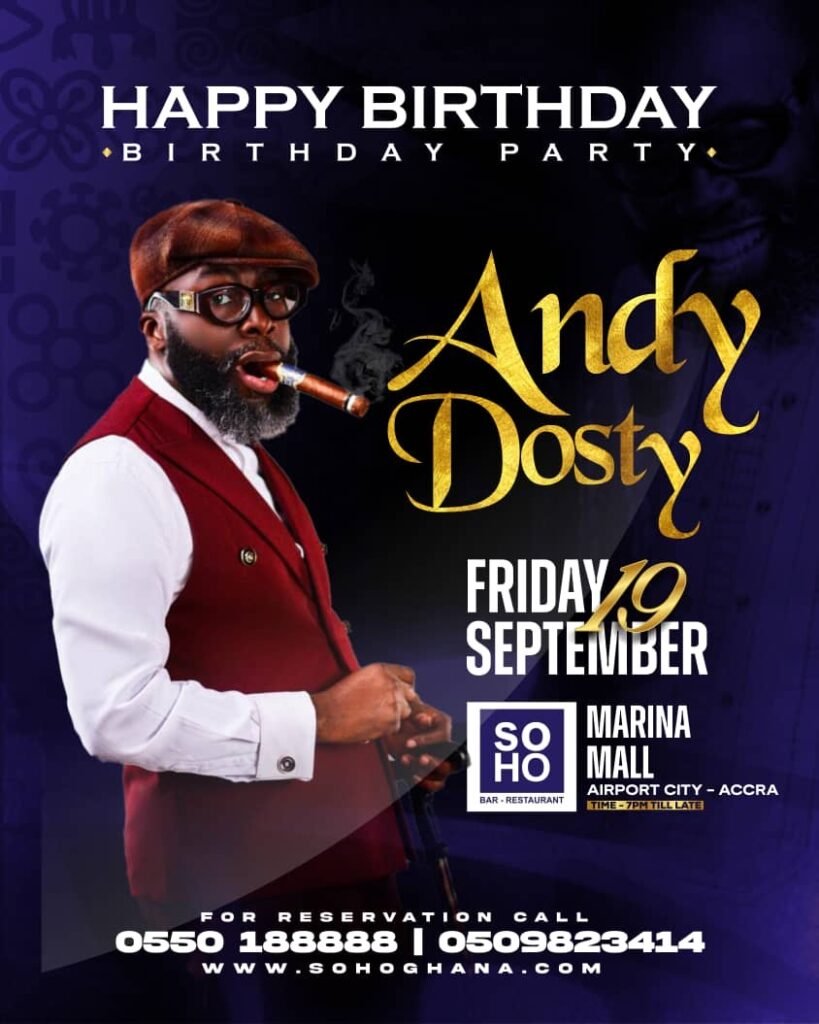 Renowned Ghanaian disc jockey and radio personality, Andy Dosty, is set to celebrate his birthday in grand style at Soho, Marina Mall, located in Airport City, Accra.