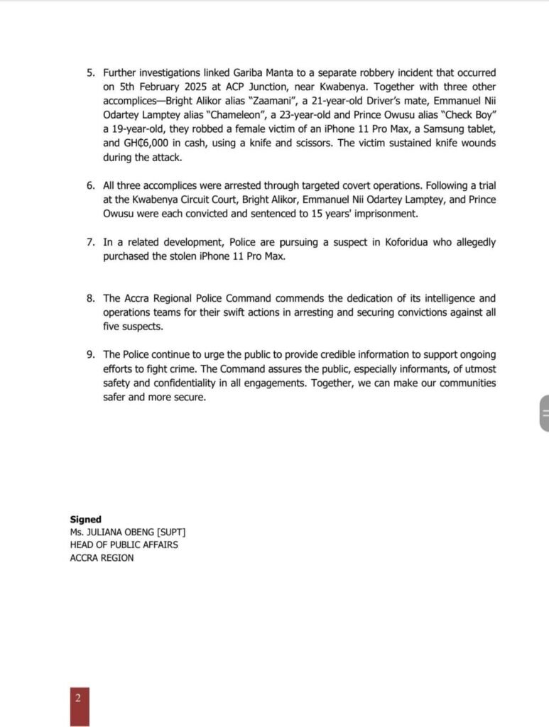 Further investigations connected Gariba Manta to a February 5, 2025, robbery at ACP Junction, where he and three accomplices—Bright Alikor alias “Zaamani,” Emmanuel Nii Odartey Lamptey alias “Chameleon,” and Prince Owusu alias “Check Boy” attacked a female victim, stealing an iPhone 11 Pro Max, a Samsung tablet, and GH¢6,000 in cash. The victim was injured during the knife and scissors attack.