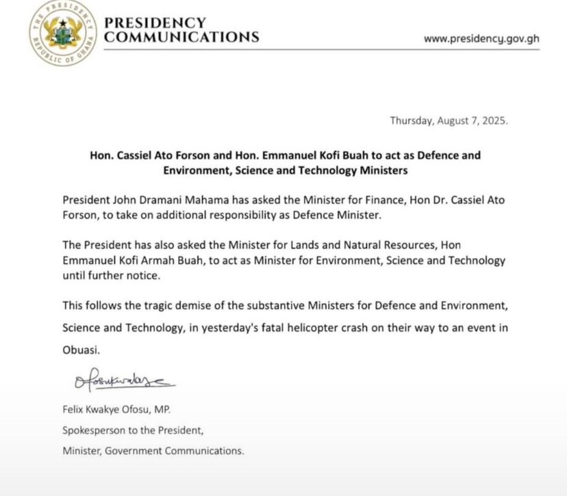 President John Dramani Mahama has appointed two acting ministers to oversee key portfolios following the tragic demise of Defence Minister Dr. Edward Omane Boamah and Environment Minister Alhaji Dr. Ibrahim Murtala Mohammed in a helicopter crash on August 6, 2025.