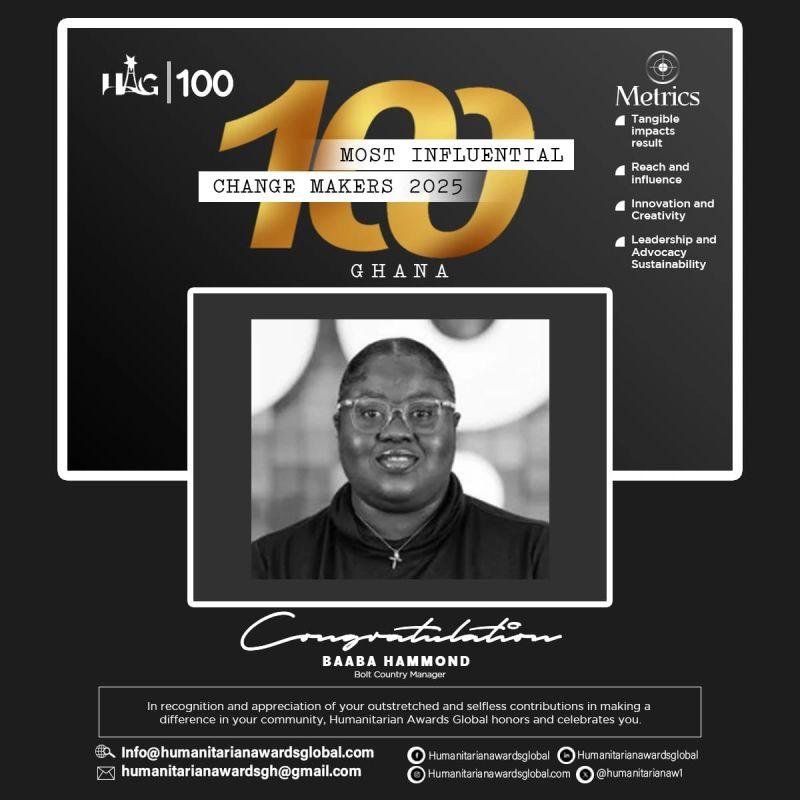 Baaba Hammond, Country Manager, Bolt for Business Ghana, has been named among Ghana’s 100 Most Influential Change Makers for 2025 by Humanitarian Awards Global, in recognition of her contributions to advancing innovation, leadership, and impact within Ghana’s mobility and business ecosystem.