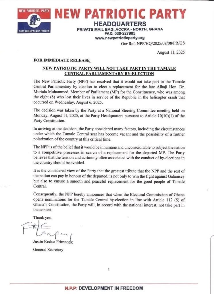 The opposition New Patriotic Party (NPP) has announced its decision not to field a candidate in the upcoming Tamale Central parliamentary by-election, following the tragic death of the constituency’s Member of Parliament, Alhaji Dr. Ibrahim Murtala Mohammed, in the August 6 helicopter crash.