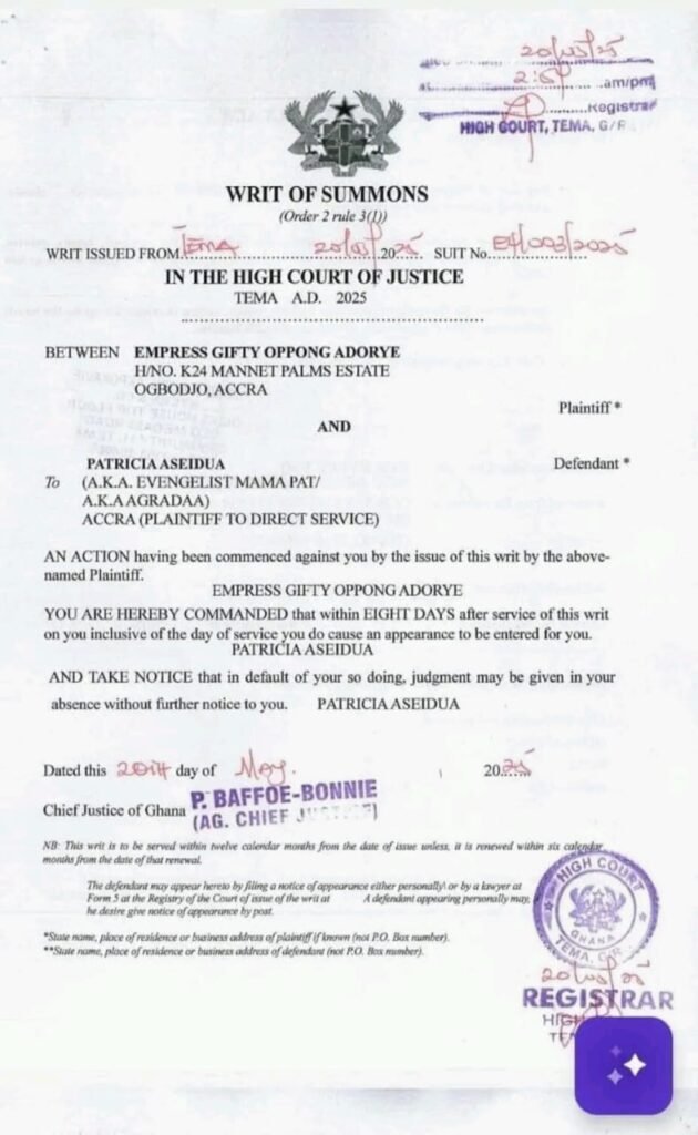 The lawsuit, lodged at the High Court of Justice in Tema on May 20, 2025, accuses Evangelist Mama Pat of making slanderous remarks that have caused considerable harm to Empress Gifty’s reputation and emotional well-being.