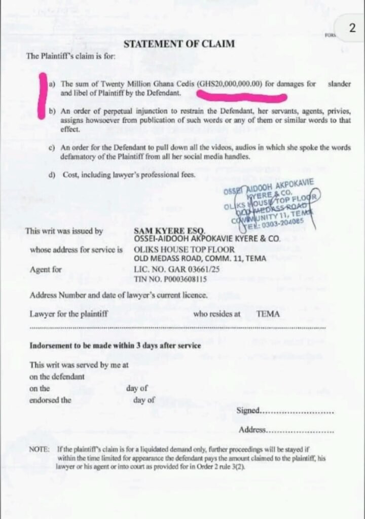 Represented by Sam Kyere, Esq., of Ossei-Aidooh Akpokavie Kyere & Co., Empress Gifty is also seeking to recover legal costs incurred during the proceedings.