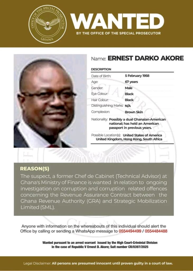 The Office of the Special Prosecutor (OSP) has intensified its crackdown on high-level corruption with a public declaration that Ernest Darko Akore, a former Technical Advisor at Ghana’s Ministry of Finance, is officially wanted in connection with the Strategic Mobilization Limited (SML) scandal.