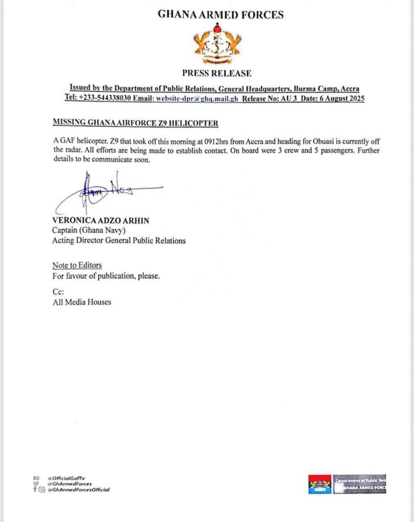 The Ghana Air Force is working diligently to locate the missing helicopter and ensure the safety of its crew and passengers.