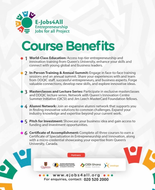 Are You an Aspiring or Existing Entrepreneur in Ghana? Looking for world-class training, mentorship, and funding opportunities? Ready to take your business or idea to the next level? Want to turn your business dreams into a reality? E-Jobs4All Program is the Answer!
