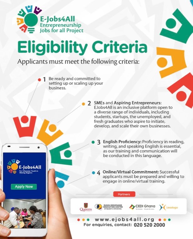 To apply, please visit https://cedighana.org/e-jobs-4-all. For inquiries, you may visit https://ejobs4all.org or https://cedighana.org, contact the E-Jobs4All Secretariat at City Galleria Mall, Airport, opposite Accra Mall, P. O. Box KA 16097, email us at info@ejobs4all.org, or call +233 20 520 2000. Thank you!