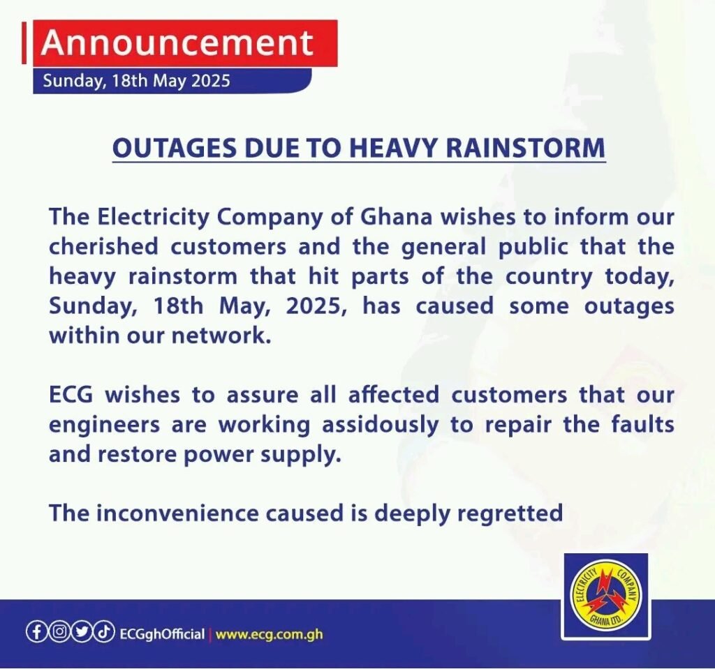 The Electricity Company of Ghana (ECG) has announced widespread power outages following a heavy rainstorm that swept through parts of the country on Sunday, 18th May 2025.
