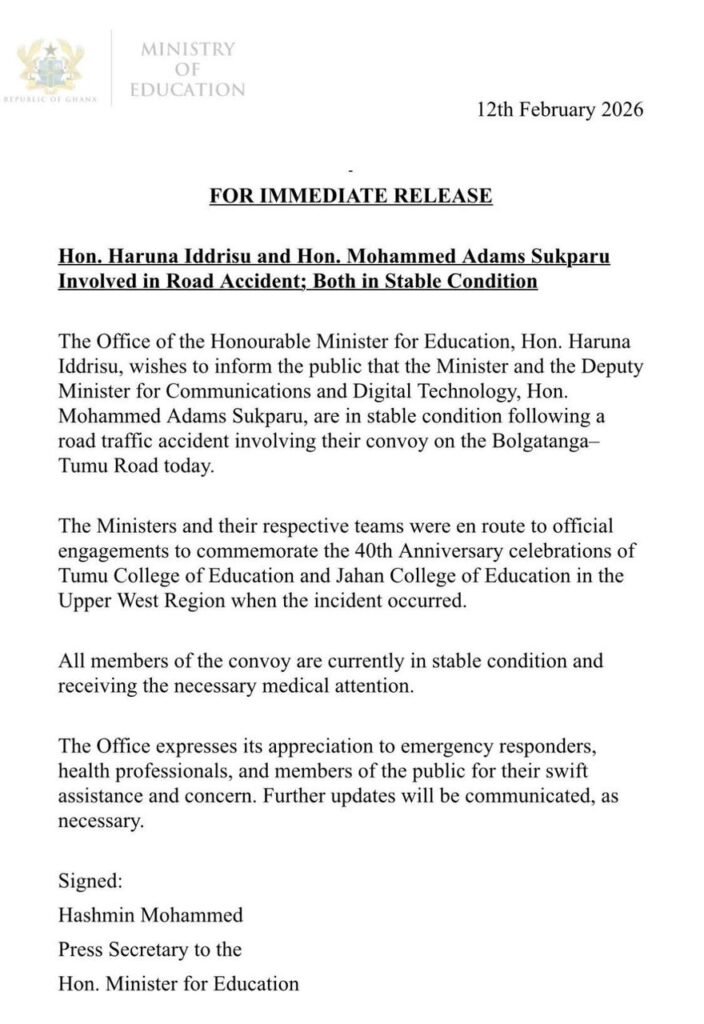 The Office of the Honourable Minister for Education has confirmed that Hon. Haruna Iddrisu and the Deputy Minister for Communications and Digital Technology, Hon. Mohammed Adams Sukparu, are in stable condition following a road traffic accident involving their convoy.