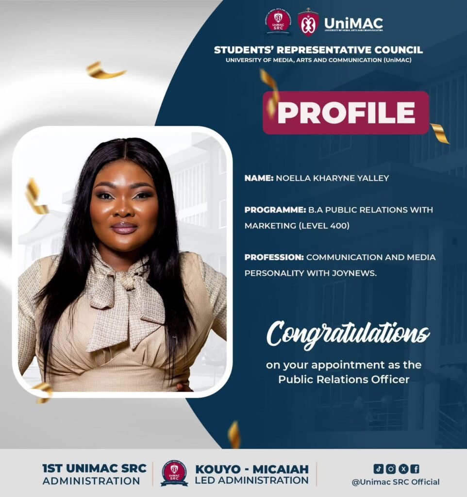 The Student Representative Council (SRC) of the University of Media, Arts and Communication (UniMAC) has announced the appointment of Ms. Noella Kharyne Yalley as the new Public Relations Officer (PRO).