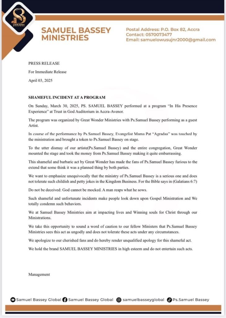 In a statement released today, April 3, 2025, Ps. Samuel Bassey’s management apologized to fans and emphasized the importance of upholding the integrity of gospel ministration.