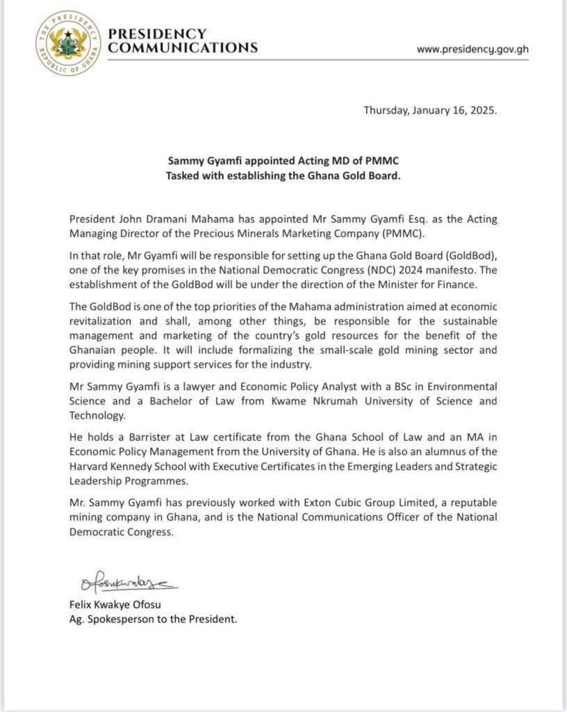 As the acting MD of PMMC, Gyamfi will oversee the sustainable management and marketing of Ghana’s gold resources, ensuring that the country’s rich mineral wealth benefits its citizens.