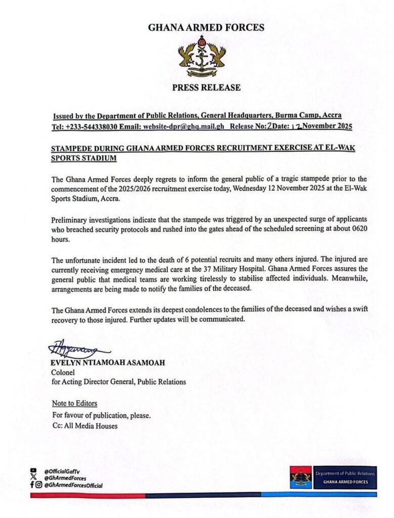 Six people have been confirmed dead following a stampede that occurred during a Ghana Armed Forces (GAF) recruitment exercise at the El-Wak Sports Stadium in Accra on Wednesday morning.