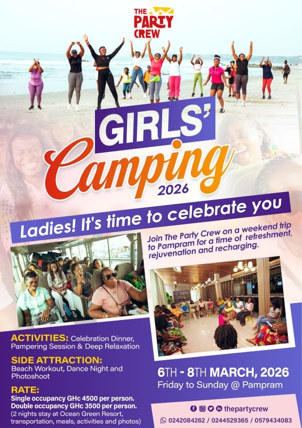 From 6th – 8th March 2026, get ready for an exciting ladies-only camping getaway at the beautiful coastal town of Prampram.
