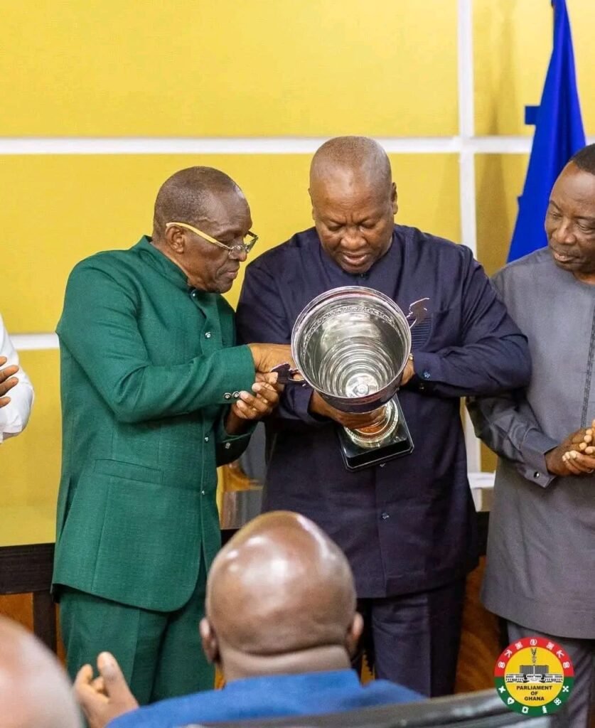Speaker of Parliament Alban Sumana Kingsford Bagbin led a high-profile delegation to the Jubilee House on Tuesday, September 2, 2025, to officially present the coveted Democracy Cup trophy to President John Dramani Mahama.